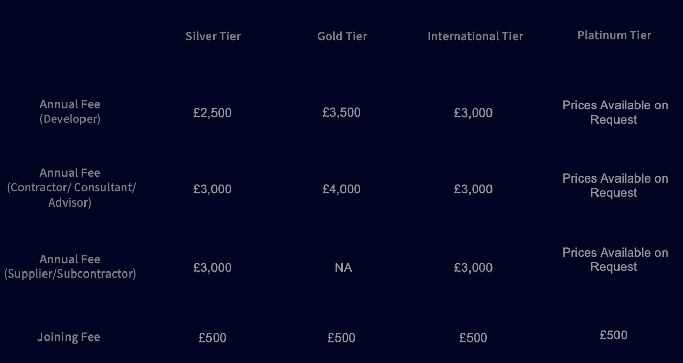 The Luxury Property Forum brings together Suppliers and Subcontractors, Consultants, Advisors, Contractors, Developers and Investors who are all experts in the luxury property sector. The Membership Tiers available are split into Silver, Gold and Platinum depending on the average GDV of a single development. We also have an International Tier. All prices are exclusive of VAT.